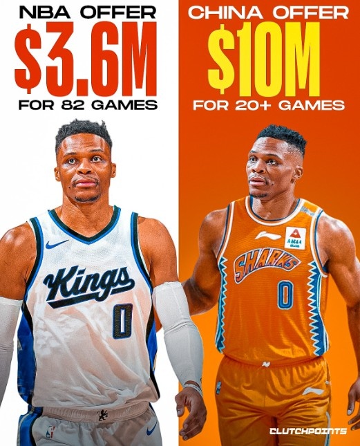 10月15日訊 美媒ClutchPoints報(bào)道,據(jù)稱有CBA球隊(duì)給威少開出了千萬美元年薪的報(bào)價(jià)。