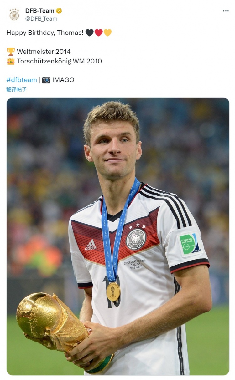 德國隊社媒曬出穆勒與大力神杯的合照,配文:“生日快樂,托馬斯!2014年世界杯冠軍、2010年世界杯最佳射手?!?/p>