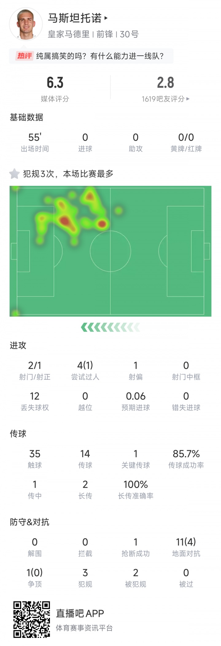 本場比賽馬斯坦托諾表現(xiàn)不佳,遭到球迷吐槽。賽中他還多次滑倒,對抗也不占優(yōu)勢,最終機(jī)構(gòu)評分僅6.3分,吧友評分僅2.8分。