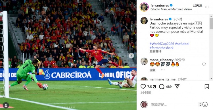 此役是費(fèi)蘭-托雷斯為西班牙隊(duì)出戰(zhàn)的第50場(chǎng)比賽,他在社交媒體上曬出比賽照片,配文:“值得銘記的夜晚,為西班牙出戰(zhàn)50場(chǎng),這是一場(chǎng)非常特別的比賽,勝利讓我們距離世界杯更近一步?!?/p>