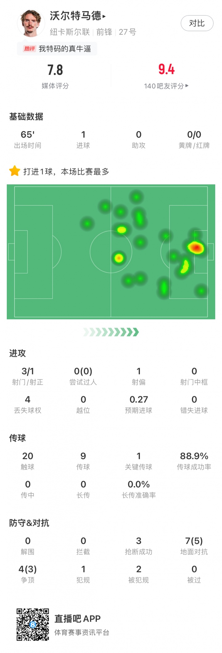 本場比賽,沃爾特馬德打入制勝球,爭頂四次成功三次,對抗七次成功五次,傳球成功率高達88.9%,還貢獻了3次搶斷。