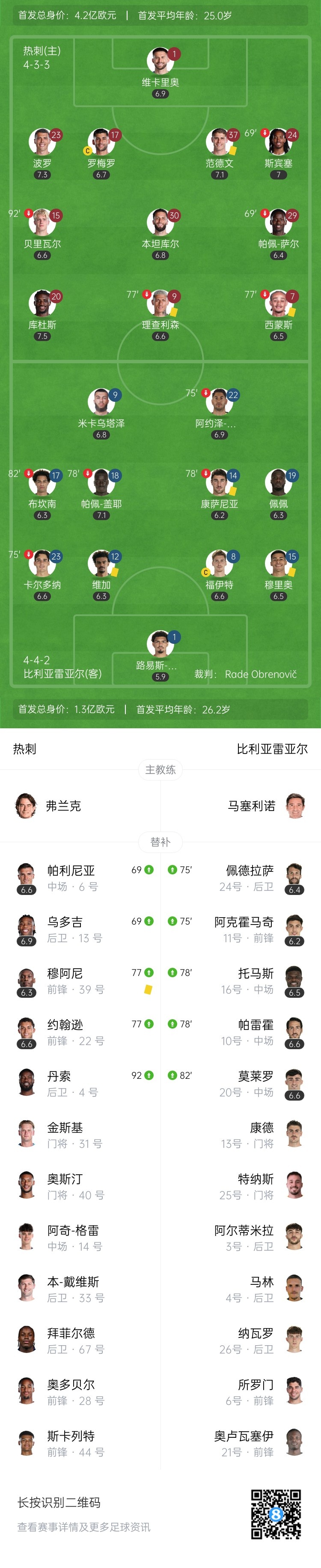 下半場傷停補時4分鐘,全場比賽結束,最終熱刺1-0比利亞雷亞爾。
