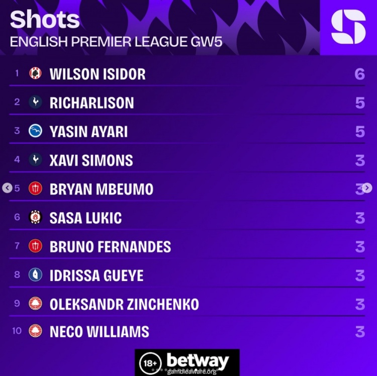 9月24日訊 英超第5輪戰(zhàn)罷,squawkafootball列各項(xiàng)數(shù)據(jù)排行,桑德蘭前鋒伊西多是本輪射門次數(shù)最多的球員,共6次。