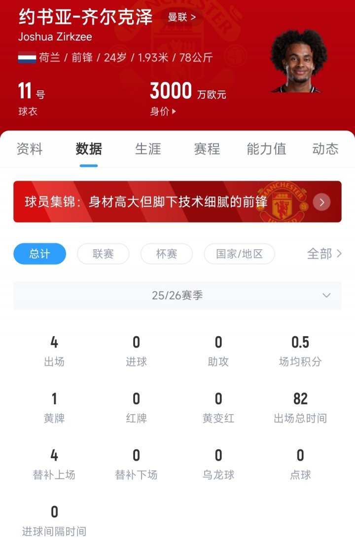 在今年夏窗曼聯(lián)簽下舍什科、姆貝莫、庫尼亞三叉戟后,齊爾克澤的地位被徹底邊緣化。本賽季曼聯(lián)8場比賽齊爾克澤均進(jìn)入名單,但沒有獲得一次首發(fā)機(jī)會,僅替補(bǔ)登場4次,總計出場82分鐘,沒有取得進(jìn)球或助攻。
