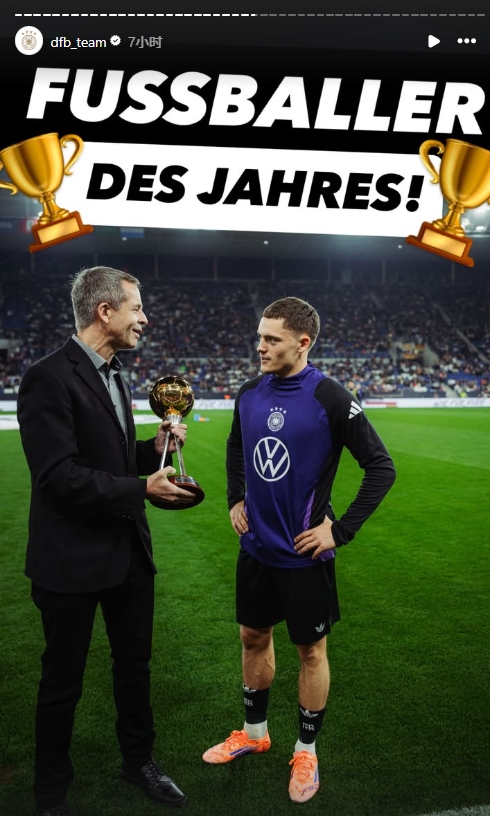 本場比賽前,維爾茨領(lǐng)取2025德國足球先生獎杯。上賽季維爾茨代表勒沃庫森出戰(zhàn)45場,打進(jìn)16球并送出15次助攻。